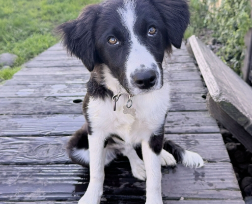 Meet Willow! Willow is an approximately 5-month-old puppy weighing about 23 pounds, and she’s the perfect mix of adventurous and affectionate. With her beautiful black-and-white rough coat and bright personality, she’s sure to capture hearts wherever she goes.