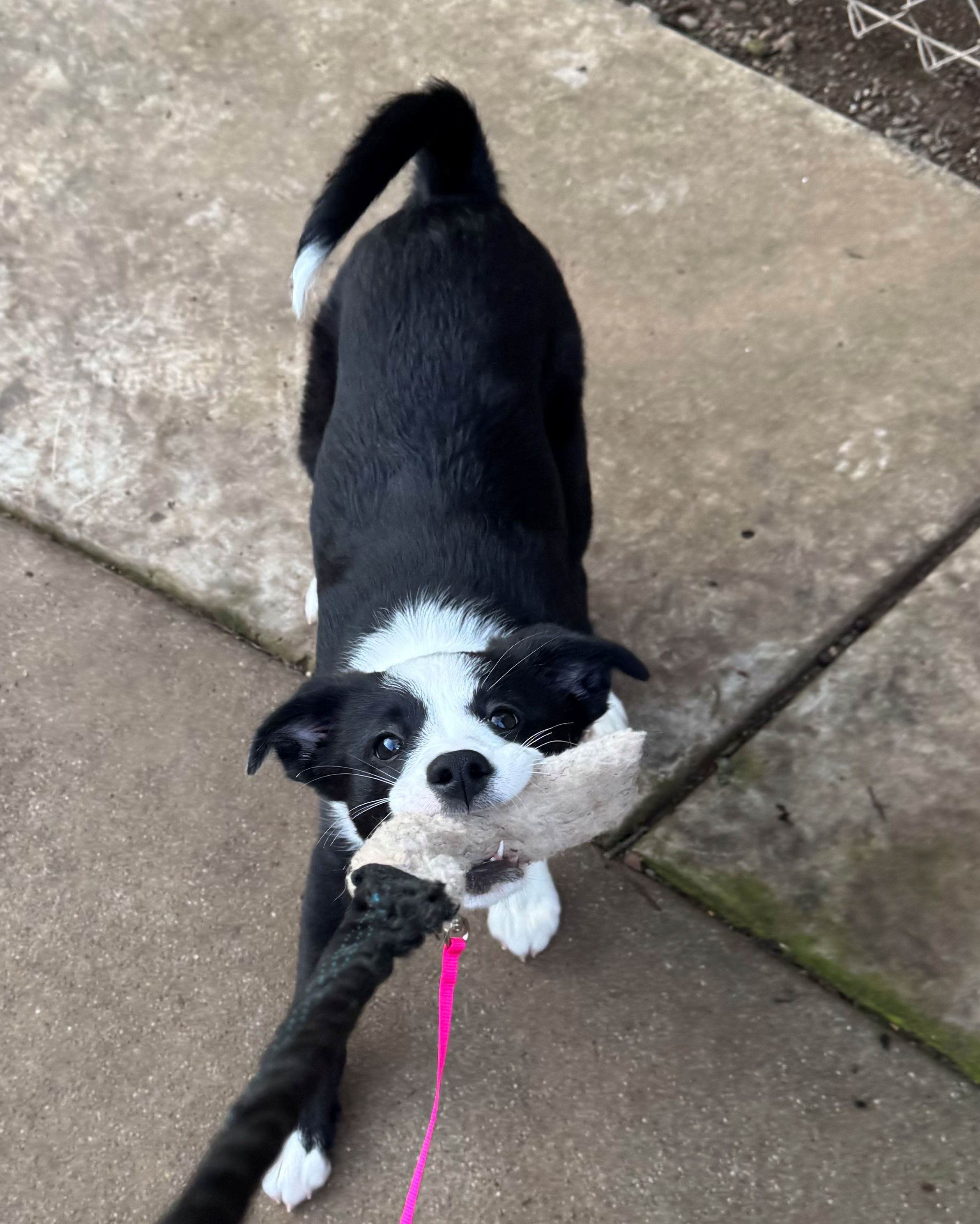 Birdie’s nickname is “Herdie Birdie.” Yes, she likes to zoom around, but she also likes to chase and sometimes grab pant legs, which are easy to confuse with a tug toy. Understanding the difference is one of her “learning objectives.” She is also learning to “sit,” “wait,” walk on a leash, and “give.” She is treat-and-toy-motivated and loves to learn. She is crate-trained, and mostly housebroken. She rides nicely in a crate in the car and loves to go on adventures.