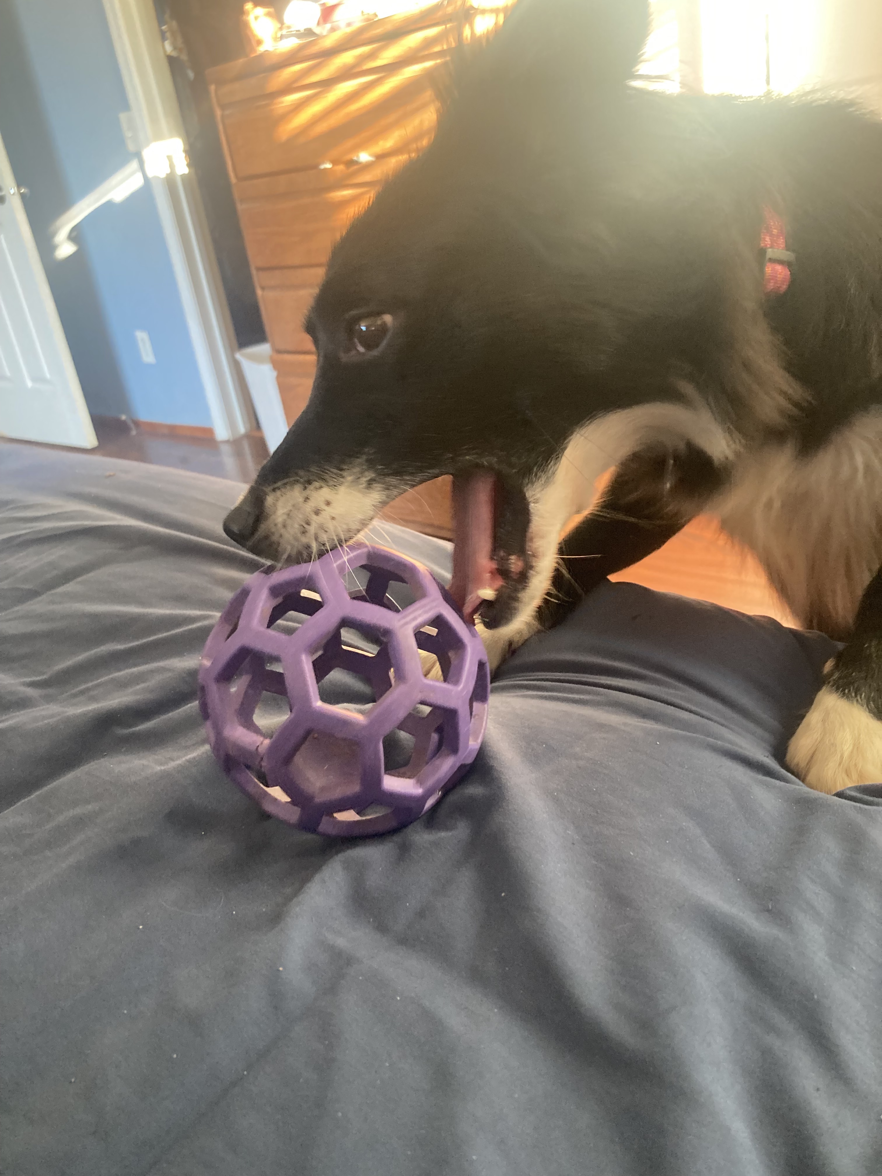 FRAZZLE loves toys; her balls and her rubber bone are top two choices. She can entertain herself with them on her own, but also likes to play with her people. FRAZZLE also loves to explore the backyard on her own or with her foster family. She will take herself for long, roaming adventures around the farm, coming when she’s called, even if reluctantly. While she loves play, running, and adventuring, FRAZZLE easily settles down for a nap after activity, and returning home after being away is truly her favorite thing!