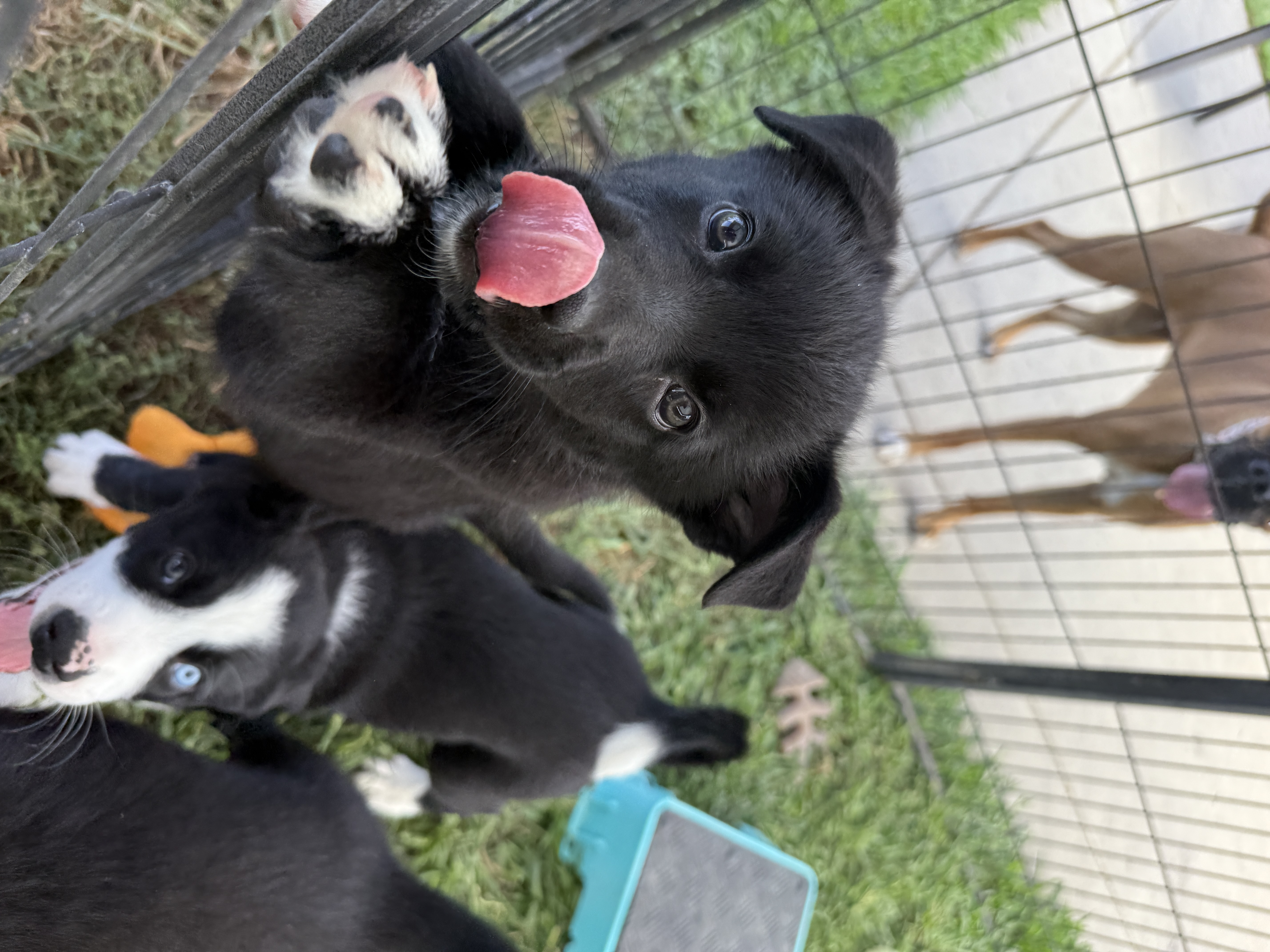 Each puppy has been introduced to basic training concepts, including taking food gently from a hand, and learning to lure into sit, down, and spin. They have started crate training and foundational potty training. Their pen environment changes daily to expose them to different textures, objects, and sounds, helping build strong environmental confidence. They are comfortable with items moving under their feet and sleeping in a separate room from humans.