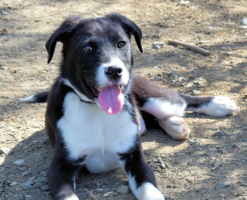 Meet Willow! Willow is an approximately 5-month-old puppy weighing about 23 pounds, and she’s the perfect mix of adventurous and affectionate. With her beautiful black-and-white rough coat and bright personality, she’s sure to capture hearts wherever she goes.
